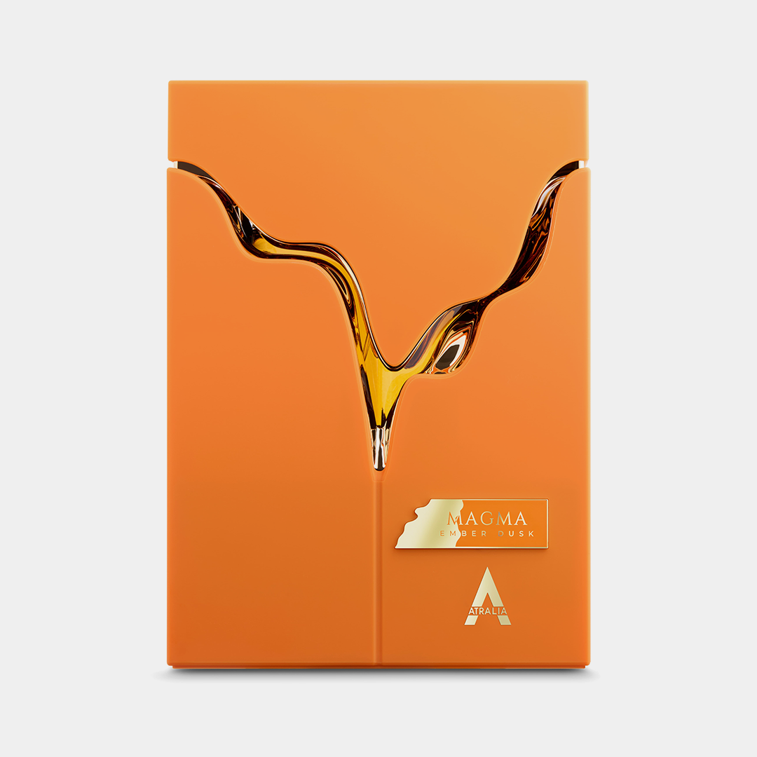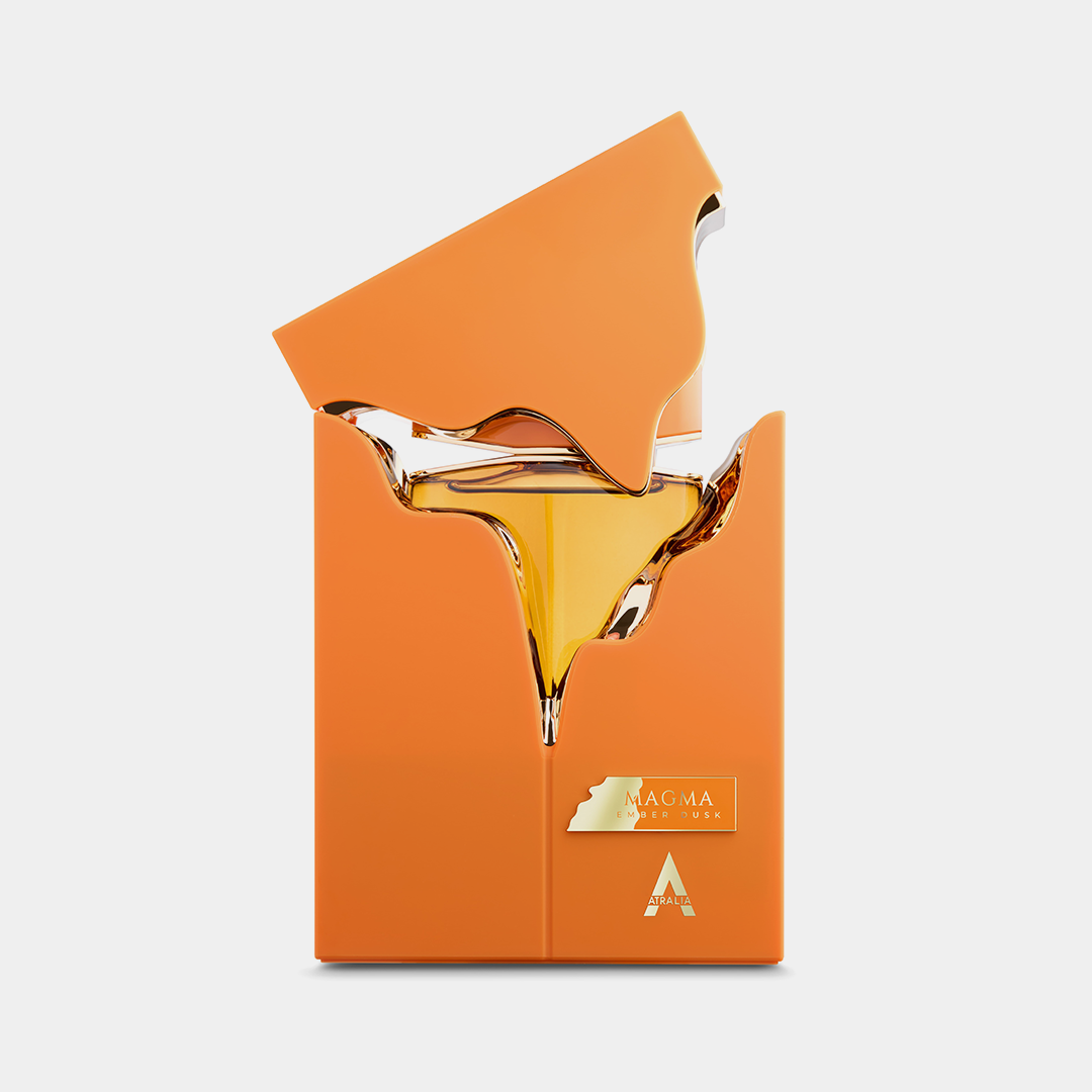 Atralia Magma Ember Dusk is a bold and magnetic scent that strikes a balance of warmth and refinement. It opens with the spiced sweetness of nutmeg, softened by orange blossom, white florals, and golden honey. At the heart, cashmere wood blends with jasmine sambac absolute, while a touch of cinnamon adds warmth and character. The fragrance settles into a base of creamy tonka bean, vanilla, and cedarwood, finished with a subtle powdery accord that lends comfort and sophistication. The result is a fragrance that feels powerful yet inviting, weaving sweetness, spice, and woods into a trail of lasting intensity.